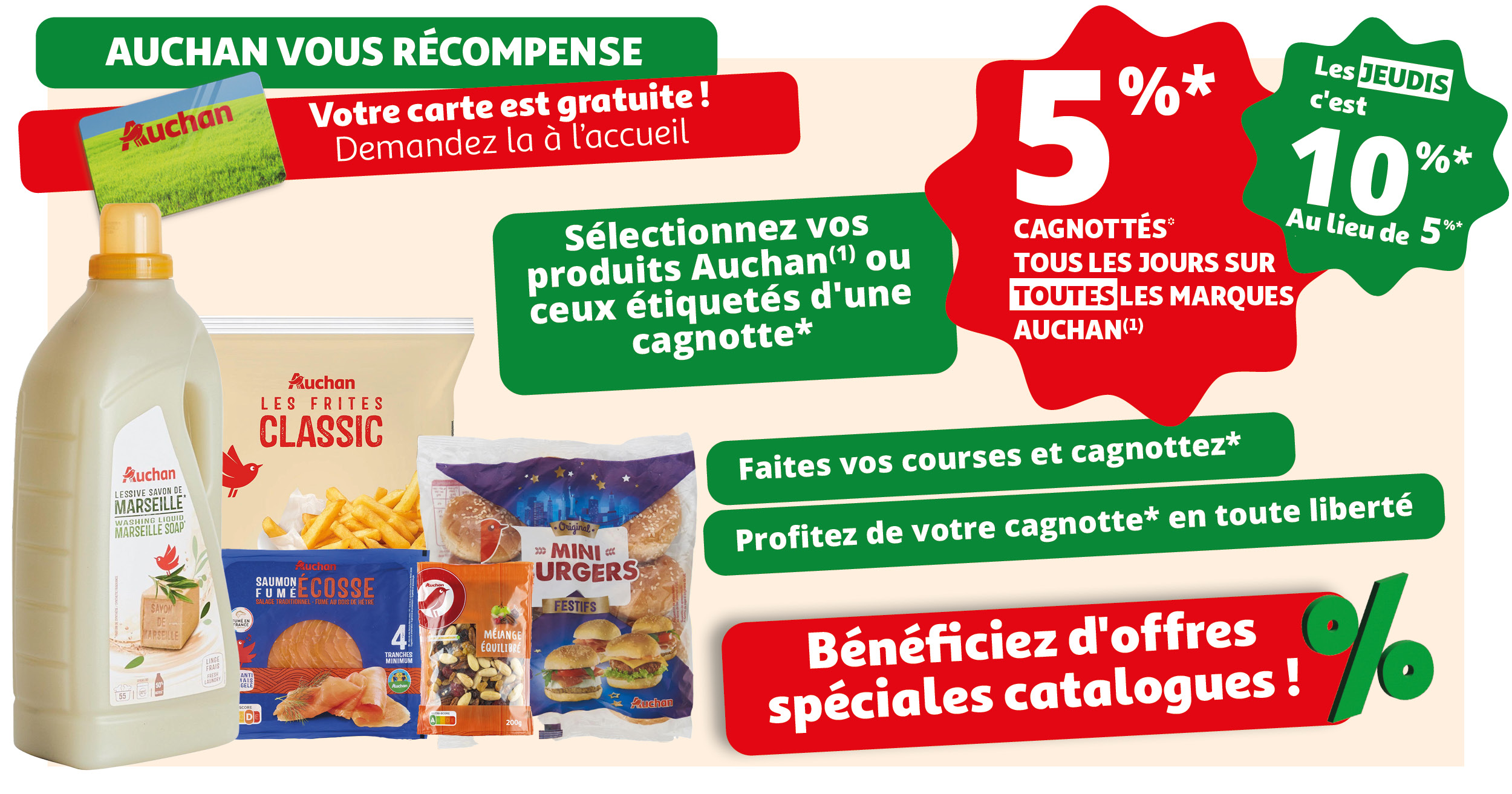 *Offres non cumulables entre elles et avec toutes offres promotionnelles en cours et réservées aux particuliers porteurs de la carte Auchan (gratuite). Voir modalités détaillées du programme de fidélité à l'accueil du magasin. (1) 5% cagnottés tous les jours (sauf les jeudis 10%) sur touts les produits Auchan rayon épicerie, liquide, droguerie, parfumerie, frais libre-service et hors promo. (ex : Auchan Bio, Auchan collection...). Hors produits porteurs du pouce, boissons alcoolisées, produits emballés sur place en magasin, fruits et légumes frais, boucherie, volaille et alimentation bébé de 0 à 4 mois.